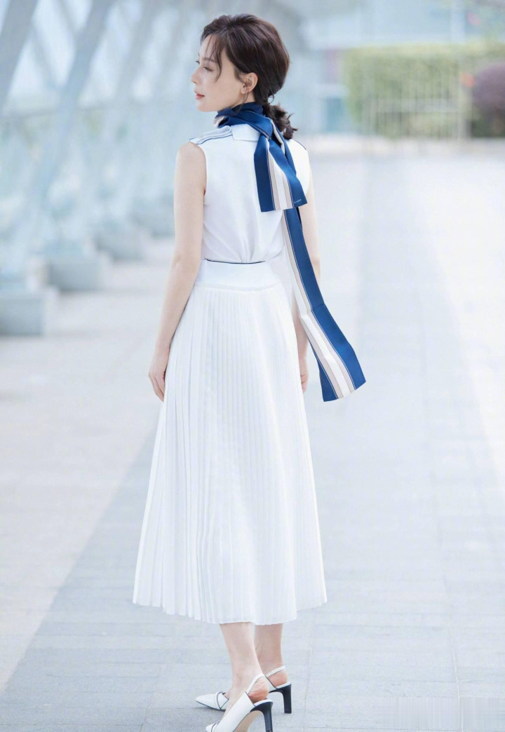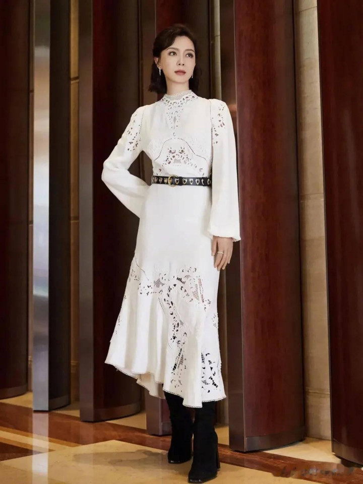 陈数的裙装造型中,“过膝”是铁律。无论是连衣裙、半身裙还是礼服裙,裙摆始终保持在膝盖以下。这种选择看似保守,实则暗藏巧思——既保留了东方女性的含蓄美,又通过剪裁、材质与搭配的细节,让端庄与时尚并存。